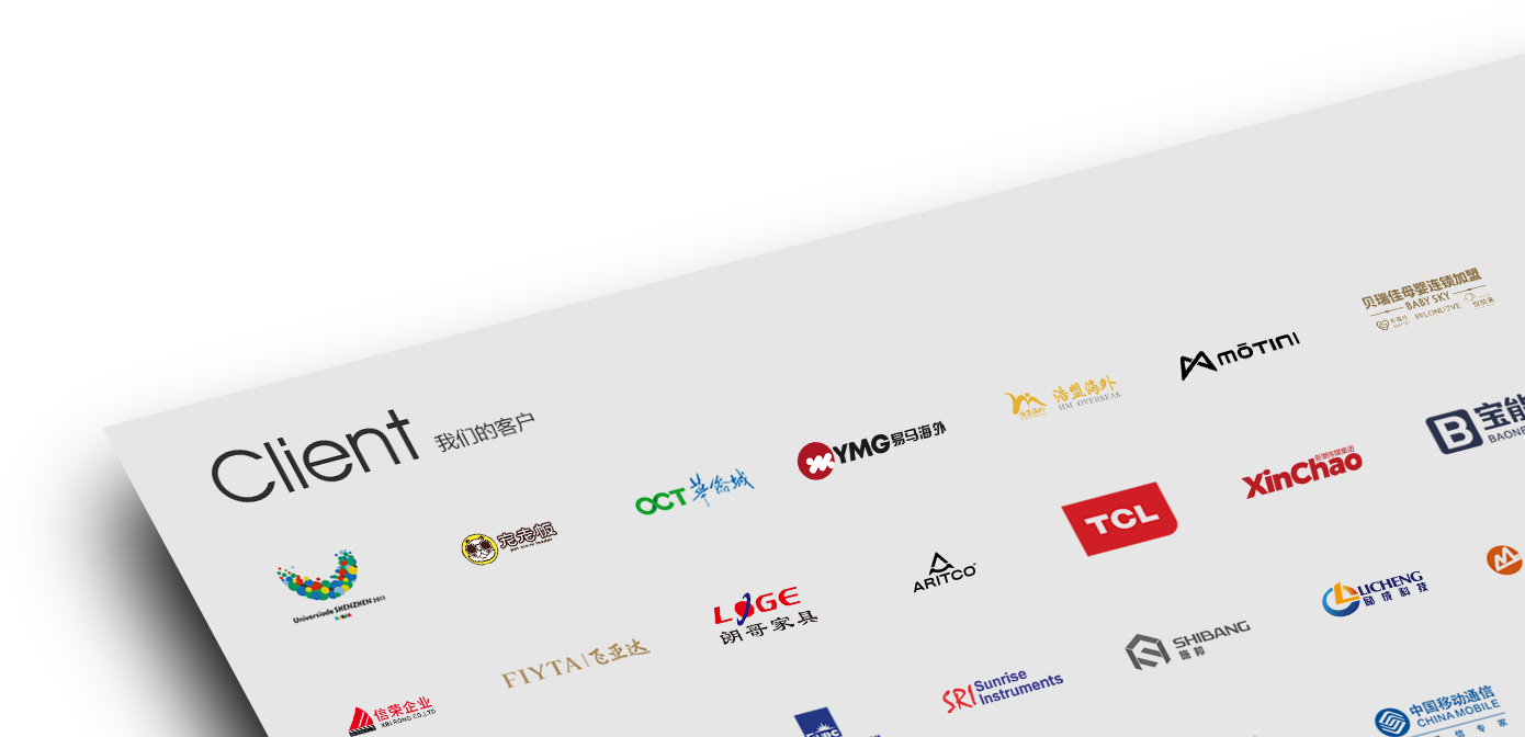 我們的客戶來自各行各業(yè),為了共同目標,我們在工作上密切配合,從創(chuàng)業(yè)型小企業(yè)到知名品牌,感謝他們對我們的高要求,感謝他們從不同領(lǐng)域給我們帶來的挑戰(zhàn),讓我們激情的團隊有機會用頭腦與智慧不斷的給客戶帶來驚喜。